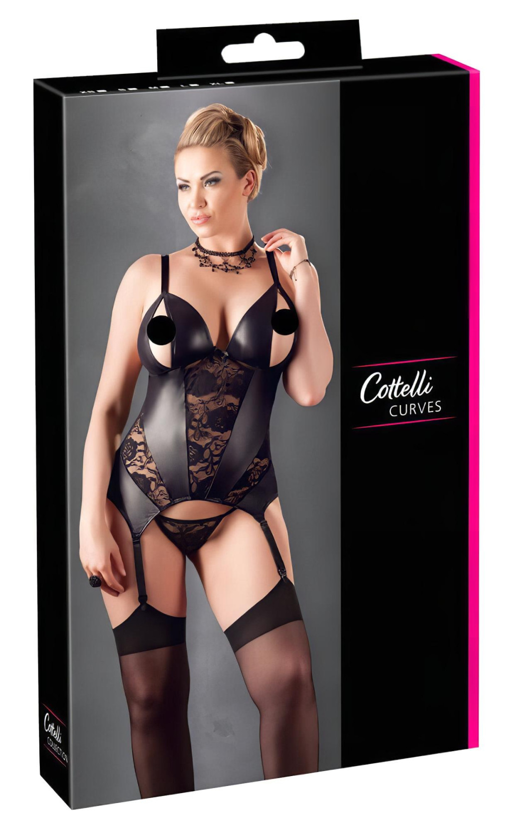 Szaténos anyagból készült harisnyatartós felső, virágos csipke berakásokkal, hátul rugalmas, áttetsző anyagból. Nyitott mellrésszel, hozzáillő tangával. A váll- és harisnyatartó pántok állíthatóak.