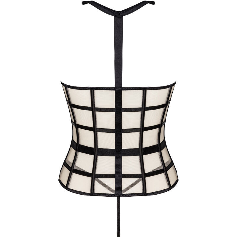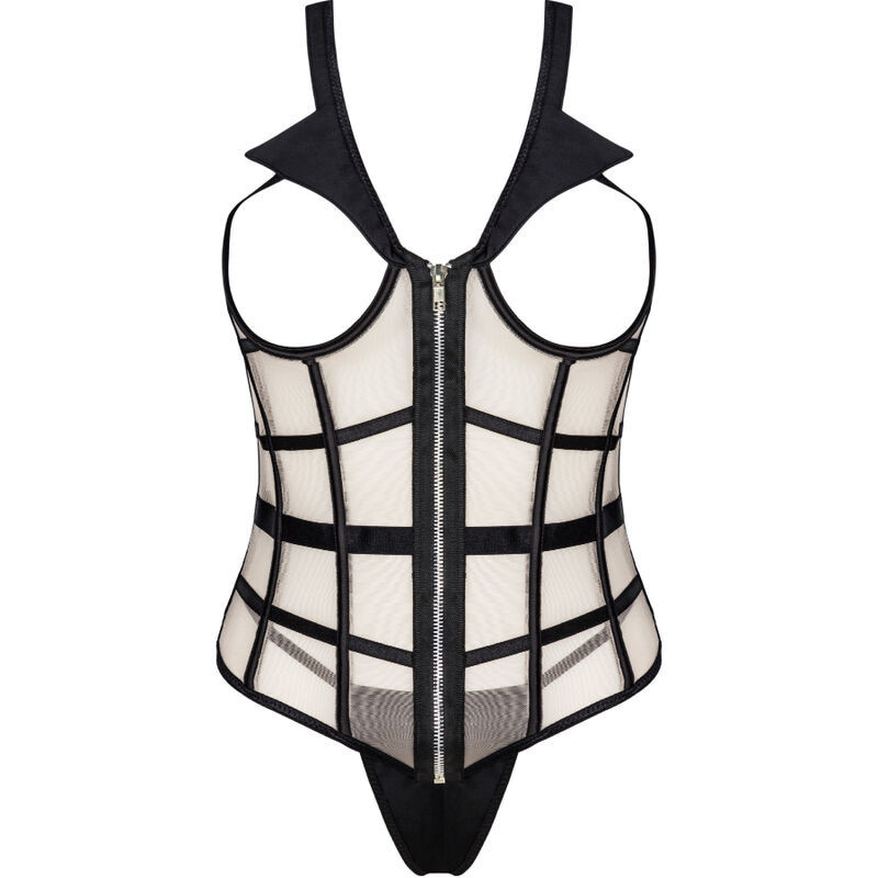 Merüljön el a csábítás világában ezzel a lenyűgöző, két részes szettel, amely egy érzéki, dús melleket kihangsúlyozó fűzőből és egy szexi fekete tangából áll. A fűző elöl zippel záródik, így rendkívül egyszerűen felvehető. A fekete és bézs színek vonzó kombinációt alkotnak, a csábító részletek, mint például a fekete gallér és a deréknál kihangsúlyozott fűzőpántok, pedig igazán izgalmas megjelenést biztosítanak.