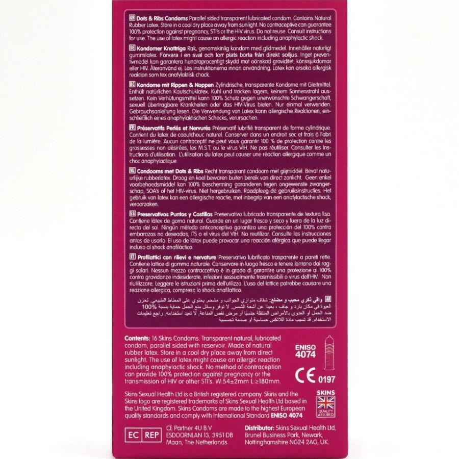 Ne feledd! A megfelelő használat mellett a Skins Dots & Ribs jelentősen csökkenti a terhesség és a szexuális úton terjedő fertőzések kockázatát. Merülj el az élvezetek tengerében, és sose indulj el otthonról Skin nélkül!
